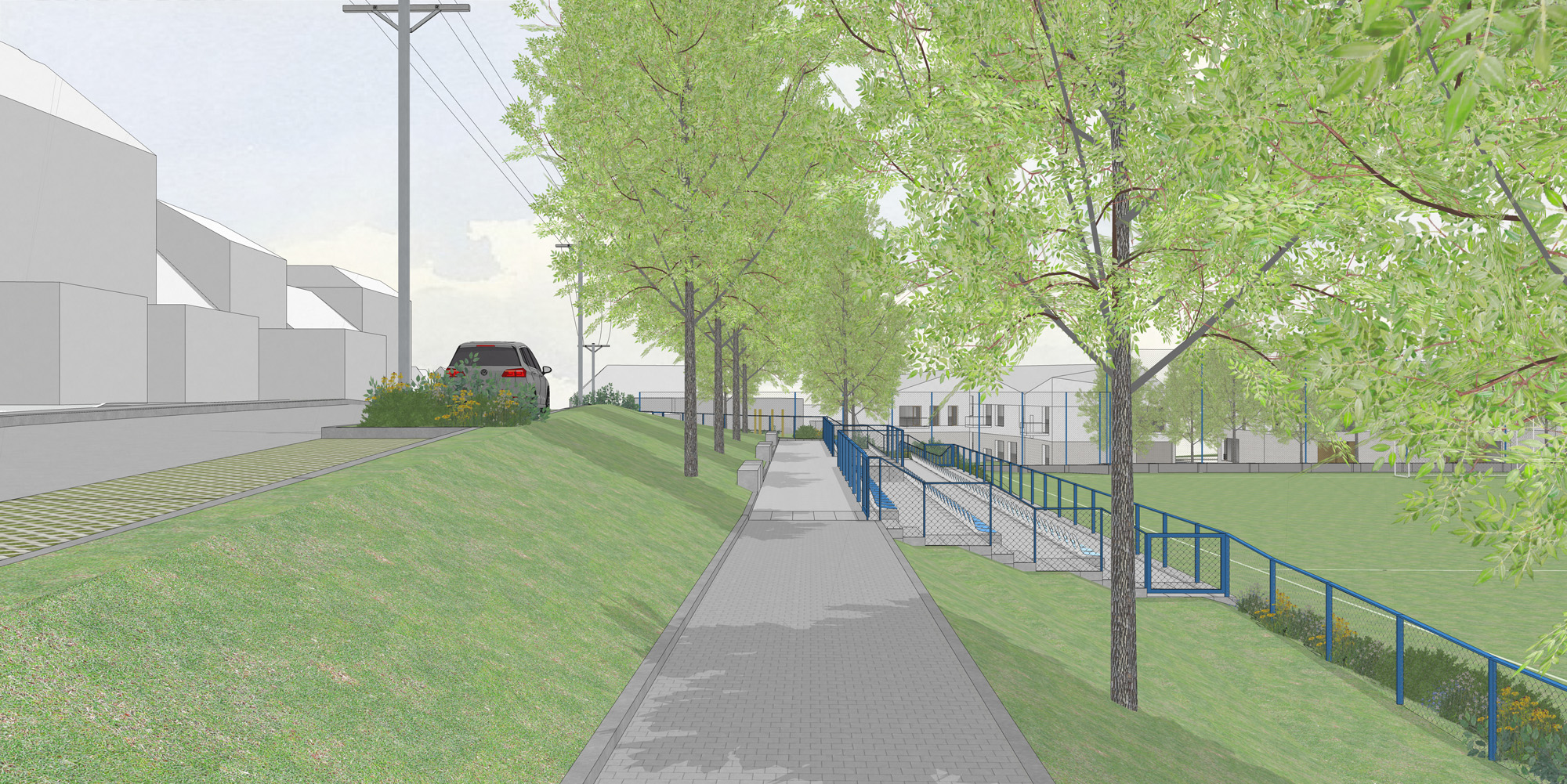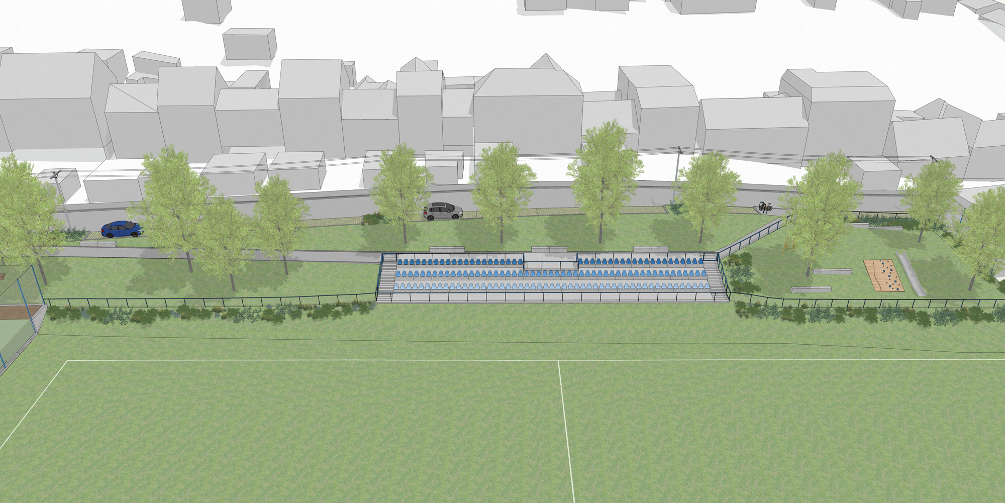 Současně s výstavbou tribuny připravuje tamní radnice komplexní úpravu Vzhledné ulice a okolí hřiště. Letos tak vznikne promenádní chodník kolem tribuny. Na příští rok se plánuje vybudování nových podélných parkovacích míst. V letech 2027 až 2028 chtějí vybudovat nový vstup na hřiště s umělým povrchem po rampě, aby se eliminoval pohyb přes hrací plochu.
